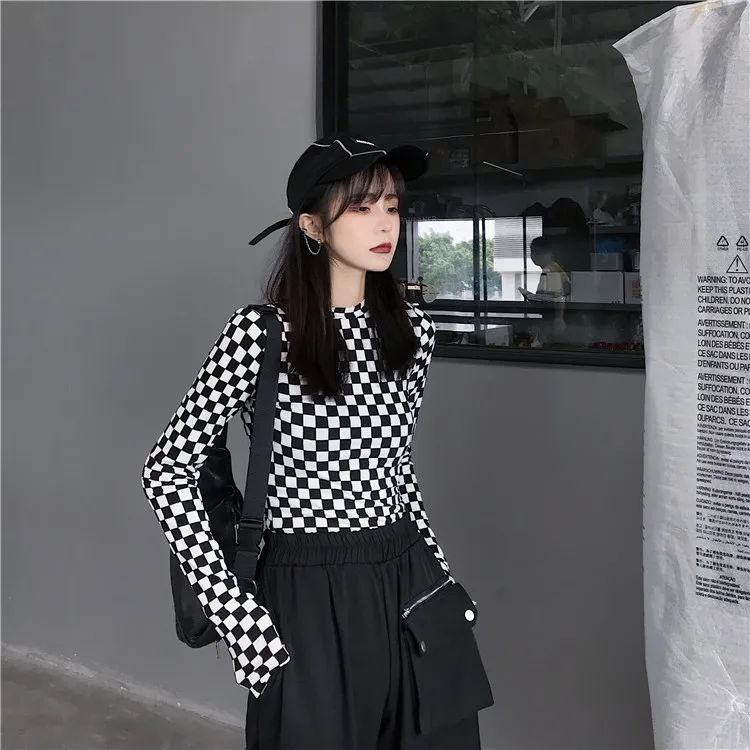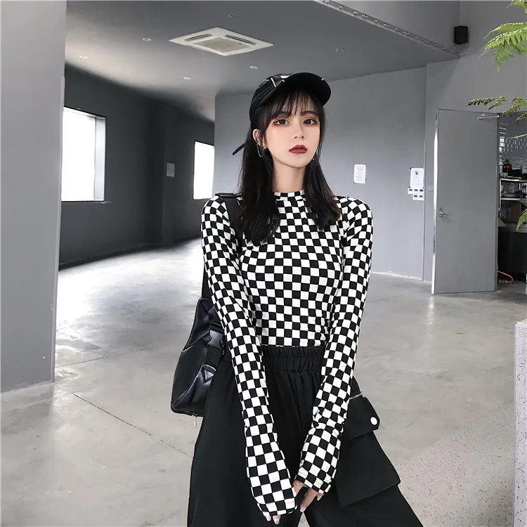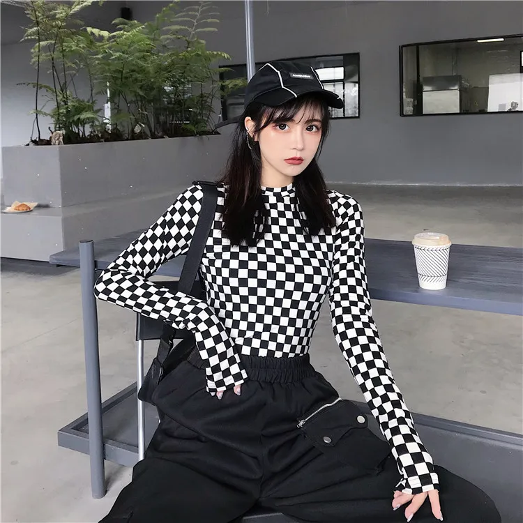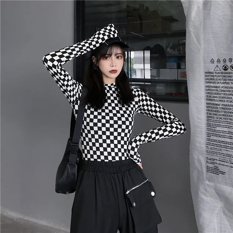 Black & White Checkered Mesh Top Long Sleeve Mock Neck Cropped Top Women's T-shirts Altgirl Outfit /Black & White Checkered Mesh Top Long Sleeve Mock Neck Cropped Top Women’s T-shirts Altgirl Outfit /