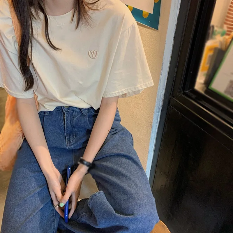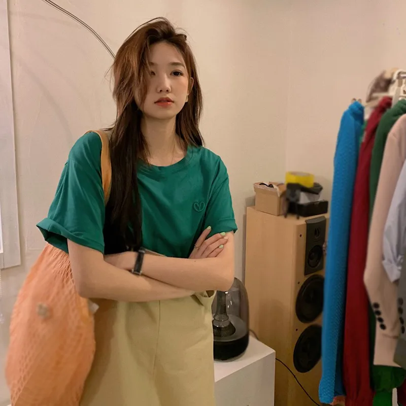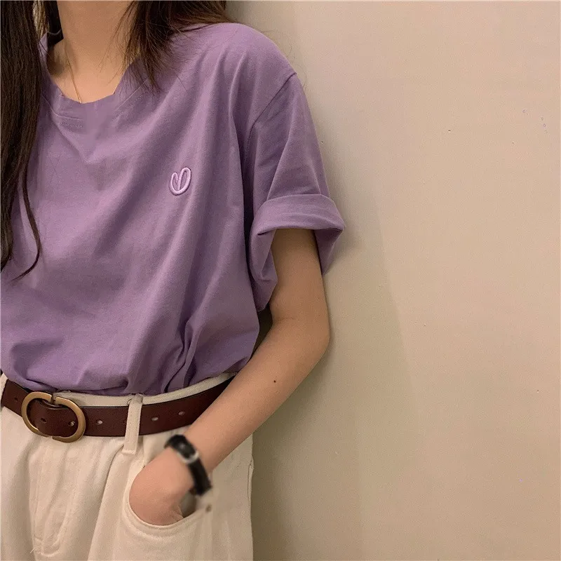 Summer Loose Round Neck T-Shirt Simple Embroidery Casual Versatile Short Sleeved Tees Women's Cozy Cotton Solid Color TopSummer Loose Round Neck T-Shirt Simple Embroidery Casual Versatile Short Sleeved Tees Women’s Cozy Cotton Solid Color Top